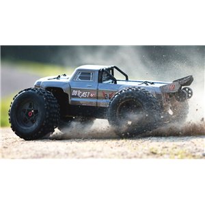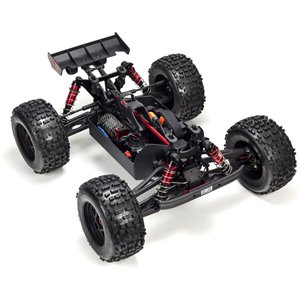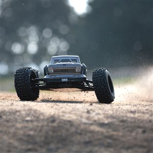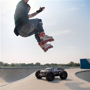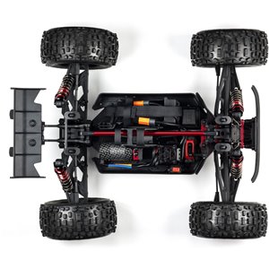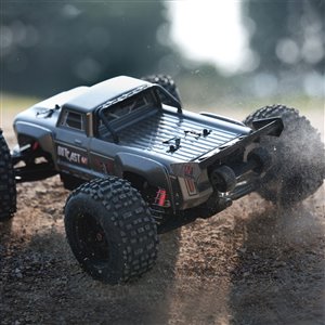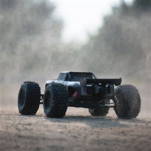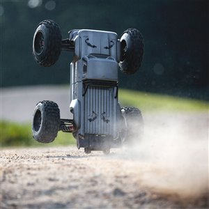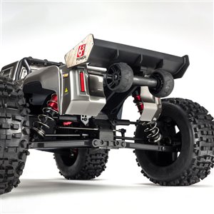 For the resilience needed to support extreme stunts, ARRMA® uses a strong anodized aluminum chassis as the foundation. A center body support and aluminum center brace plus composite chassis side pods add more strength. All-metal diff outdrives and gearbox internals plus durable steel driveshafts provide a dependable, heavy-duty drivetrain that holds up to extreme stunts and high-speed bashing. A new "never loose" aluminum steering servo saver and "never pop" ball ends supply more precision, reliability and confidence.