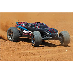 RUSTLER VXL (#37076-4) SPECS Length: 17.5" (445mm) Front Track: 12.25" (311mm) Rear Track: 12.25" (311mm) Weight: 59.6oz (1.69 kg) Height (Overall): 7" (178mm) Wheelbase: 11.375" (289mm) Front Shock Length: Long Rear Shock Length: XX-Long Front Tires (Pre-Glued): Alias™ Ribbed 2.8" Rear Tires (Pre-Glued): Alias™ Step-Pin 2.8" Front Wheels: 2.8" Black-Chrome (All-Star™) Rear Wheels: 2.8" Black-Chrome (All-Star™) Electronic Speed Control: VXL-3s™ Electronic Speed Control Motor (Electric): Velineon® 3500 Brushless Gear Ratio (internal): 2.72 (Final Drive: 9.05) Differential Type: Planetary Gear Pitch: 48-Pitch Transmission: Magnum 272™ Steering: Bellcrank Chassis Type: Modified Tub Chassis Material: Composite Nylon Radio System: TQi™ 2.4GHz Radio System w/TSM Receiver Top-Speed: 70+mph** Skill Level: 2 *Battery Tray Dimensions: 139mm x 47.5mm x 28mm Required Items: NiMH or LiPo Battery, Charger, 4 "AA" Batteries (Transmitter) *Battery expansion kit available (#3725X) **With 3S LiPo battery and optional 31-tooth pinion gear (sold separately)