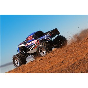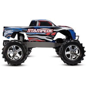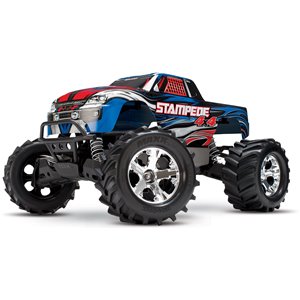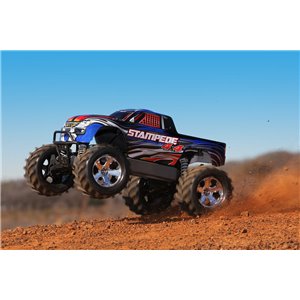 Specifications Length: 15.63 Inches (397mm) Front Track: 13.39 Inches (340mm) Rear Track: 13.39 Inches (340mm) Center Ground Clearance: 2.95 Inches (75mm) Weight: 90.46oz (2.57kg) Height (total): 8.94 Inches (227mm) Wheelbase: 10.83 Inches (275mm) Shock Length: Long (front), XXLong (back) Tires: Chevron Maxx™ 2.8" Tire Size: 5.10 Inches (129mm) (front and back) Wheels (front/rear): 2.8" Chrome (All-Star™) Wheel Size: 2.8 Inches (72mm) Outer 2.8 Inches (72mm) Inner Speed Control Type: XL-5™ Electronic Speed Control Motor (electrical): Titan® 12T 500 (12-turn) Total Drive Ratio: 23.5 (stock, out-of-box) Differential Type: Hardened Steel Bevel, Sealed, Limited Slip Equipment Pitch: 32 Chassis Structure/Material: Molded Tub / Nylon Composite Drive System: Shaft-Driven, Direct Drive 4WD Steering: Dual-Bellcrank with Integrated Servo Saver Radio System: TQ™ 2.4GHz (2-channel) Body: ProGraphix, Traxxas Stampede Leading Speed: 30+miles per hour** Ability Level: 1 *Battery Tray Dimensions: 142mm x 48.5mm x 23mm, 25mm Consisted of Battery Charger: Traxxas 4-amp DC Peak Finding Quick Battery Charger Consisted of Batteries: Traxxas 7-cell NiMH battery with iDTM Needed Products: 4 "AA" Batteries (for transmitter) *With optional speed pinion equipment (offered independently) **Battery growth package readily available (#6727X).