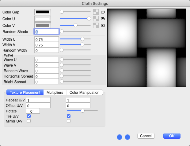 The Cloth texture map can be used to generate a procedural cloth texture. It gives a high level of control making it an easy matter to produce the look of a loose or close weaved cloth. It also allows control over the amount of random weave distortion and its channels can be connected to texture maps.