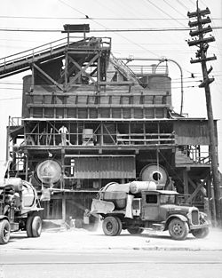 A concrete plant consists of large hoppers for storage of various ingredients like cement, storage for bulk ingredients like aggregate and water, mechanisms for the addition of various additives and amendments, machinery to accurately weigh, move, and mix some or all of those ingredients, and facilities to dispense the mixed concrete, often to a concrete mixer truck.