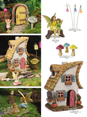 MG38 (min 12) Glow Flowers (31/2" tall) (12 sets of 3, glows in the dark) $4.25 MG306 (min 12) Sisters on Bench $4.85 MG199 (min 12) Polka Dot Mushrooms (Set of 3) $4.50 MG150 (min 4) Merrifield House (8 1/2" tall) 5 $17.50