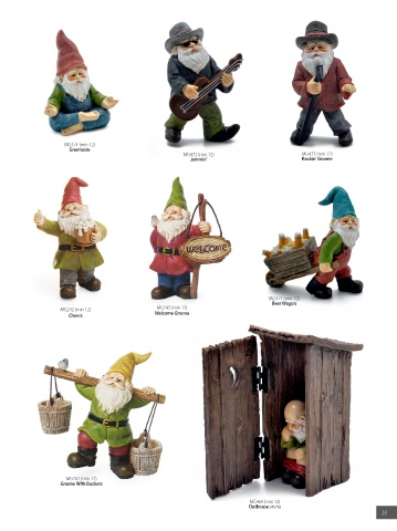 MG474 (min 12) Gnomaste MG472 (min 12) MG473 (min 12) Jammin' Rockin' Gnome MG471 (min 12) Beer Wagon MG242 (min 12) MG243 (min 12) Cheers Welcome Gnome MG241 (min 12) Gnome With Buckets MG469 (min 12) Outhouse (4 ⁄2"h) 1 28