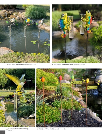 X730 (18 min) Bird Rain Gauge (3 assorted) • 4"w x 27"h SR53 (min 12) Chameleon Rain Gauge (2 assorted) • 6"w x 48"h X729 (12 min) Hummingbird Rain Gauge SR42 (12 min) Welcome Birds (4 assorted) • 14"w x 42"h 9"w x 42"h 43